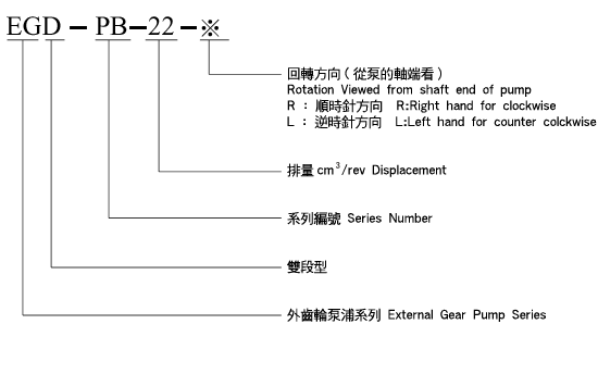 EGD-PB 型號(hào)說明/HOW TO ORDER: 產(chǎn)品特性: 1、高壓力、高效率 2、特殊的齒形設(shè)計(jì)、低噪音;符合低噪音工作環(huán)境要求。 3、體積小,節(jié)省空間。 4、本體為鋁擠合金,前、后蓋為鋁合金鑄造。 FEATURE: 1、High pressure and high efficiency applicable to all kinds of machines. 2、Special gear design,low noise agreeable to low-noise requirement. 3、Compact body and space saving. 4、Aluminum alloy,gravity casting body.Light weight and Sturdiness. 性能表/SPECIFICATION: